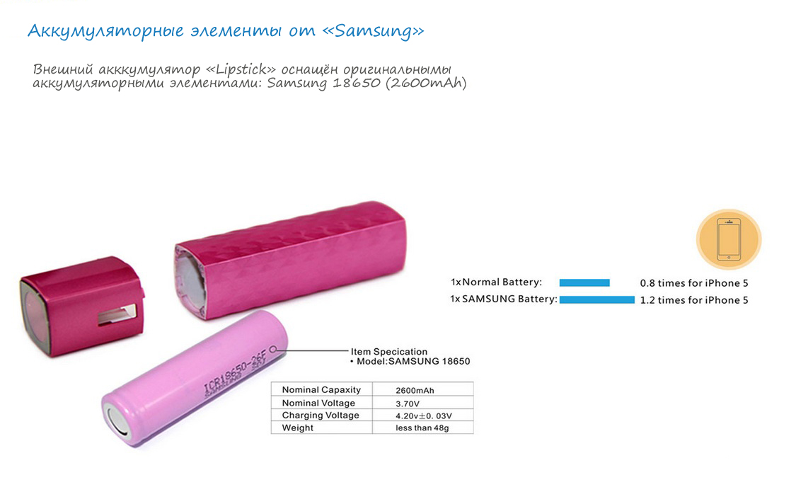 Универсальная батарея Lipstick L - 2600 – это на сегодняшний день единственное и очень правильное решение для тех, кому необходимо существенно продлить работу мобильного телефона в автономном режиме в случае когда штатная аккумуляторная батарея разрядилась и не подает признаков жизни.